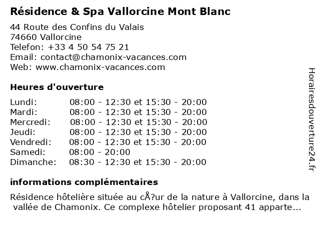 1 Le Spa Du Mont Blanc (Distance: 0,79 km) 1 Chef Lieu, 74660 Vallorcine bistrot, blanc, du, le, mont, restaurant, spa 2 Hôtel Le Montana & Spa (Distance: 6,11 km) 24 Clos du Montana, 74400 Chamonix-Mont-Blanc cafe, hotel, hôtel, le, montana, restaurant, service, spa 3 Coopérative Fruitière en Val d'Arly - Savoie Mont-Blanc (Distance: 13,03 km) 93 Rue Whymper, 74400 Chamonix blanc, coopérative, d'arly, en, entreprise, fabricant, fabrication, fromages, fruitière, mont, savoie, société, val 4 Trésorerie de Chamonix-Mont-Blanc (Distance: 13,84 km) 164 avenue de Courmayeur, 74403 Chamonix blanc, chamonix, de, mont, mont-blanc, public, trésor, trésorerie 5 Centre Hospitalier Intercommunal Hôpitaux du Pays du Mont-Blanc site de Chamonix (Distance: 14,32 km) 509 Route des Pélerins, 74400 Chamonix blanc, centre, chamonix, de, docteur, du, hospitalier, hôpitaux, intercommunal, medecins, mont, pays, sante, site 6 |