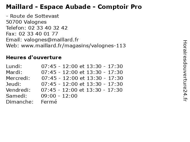 1 Maillard - Espace Aubade - Comptoir Pro (Distance: 14,95 km) 245 Rue Jean Moulin, 50110 Tourlaville aménagement, aubade, comptoir, equipement, espace, magasin, maillard, mobilier, pro 2 Maillard - Espace Aubade - Salle d'Exposition (Distance: 0,00 km) - Route de Sottevast, 50700 Valognes aménagement, aubade, d'exposition, equipement, espace, maillard, mobilier, salle 3 Espace Culturel de l’Hôtel-Dieu (Périodes Scolaires) (Distance: 2,26 km) 11 Rue de l'Hôtel Dieu, 50700 Valognes activités, centre, culturel, de, dieu, espace, l’hôtel, périodes, scolaires, Évènements 4 Comptoir Colibri (Distance: 2,60 km) 3 Rue de l'Église, 50700 Valognes alimentation, bio, colibri, comptoir, cosmétique, épicerie 5 Espace Emeraude (Distance: 3,86 km) . Nationale 13, 50700 Valognes emeraude, espace, maison, services, terre 6 PRO&Cie - Ent. Alexandre (Distance: 10,59 km) 35 Rue de la République, 50260 Bricquebec-en-Cotentin alexandre, electroménager, ent., literie, pro&cie |