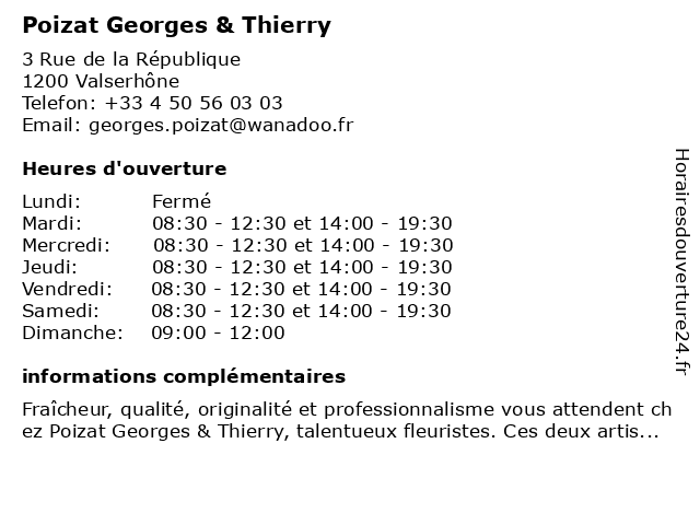 | Samedi | 08:30-12:30 et 14:00-19:30 |
