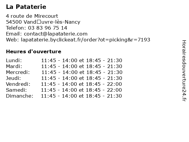 2 La Pataterie (Distance: 19,37 km) n/a Rue de la Haye Plaisante, 54200 DOMMARTIN LES TOUL beverages, children menus, dessert, la, pataterie, restaurant, salads, the potato burgers 3 La Pataterie Dommartin Les Toul (Distance: 19,34 km) Zac Du Jonchery, 54200 Dommartin Les Toul dommartin, parwel, pataterie, restaurants, toul 4 Brioche Doree (Distance: 3,97 km) - place Henri Mengin, 54000 Nancy boissons, brioche, desserts, doree, nourriture, pizzas, restaurant, salades, veinnoiseries 5 Aux Merveilleux de Fred (Distance: 4,15 km) 25 Rue Saint Didier, 54000 Nancy aux, chocolat, de, desserts, fred, merveilleux, pains 6 Comtesse Du Barry (Distance: 4,38 km) 8 Rue Stanislas, 54000 Nancy aperitif, barry, comtesse, desserts, du, restaurant, terrine |