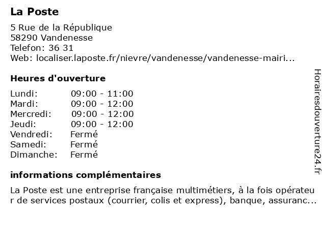 1 La Poste (Distance: 6,04 km) - Rue Eugène Collin, 58360 Saint-Honoré-les-Bains agence postale, courrier postal, expédition internationale, la, poste 2 La Poste (Distance: 8,32 km) - Au Bourg, 58290 Limanton agence postale, courrier postal, expédition internationale, la, poste 3 La Poste (Distance: 9,64 km) - Le Bourg, 58360 Sémelay agence, assurance, banque, banque postale, bureau de poste, chronopost, colis, courrier, dps, expéditions internationales, la, point, postale, poste, relais, timbres, téléphonie, ups, western union 4 La Poste (Distance: 12,97 km) 21 Route de Champrobert, 58170 Poil agence postale, courrier postal, expédition internationale, la, poste 5 La Poste (Distance: 14,87 km) - Le Bourg, 58170 Chiddes colis, courrier, enveloppe, envoi, la, lettres, livraison, paquets, poste, relais colis, timbres 6 La Poste (Distance: 15,37 km) 115 Route de Brinay, 58110 Tamnay-en-Bazois agence, colis, courriers, expédition, la, postale, poste, relais |
