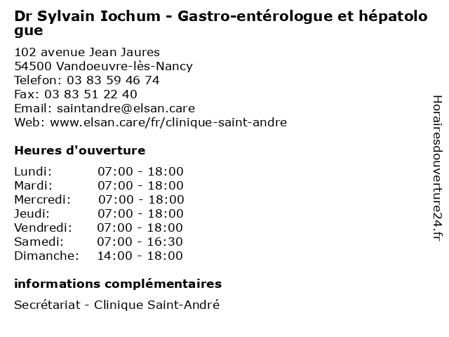 1 Dr Sylvain Iochum - Gastro-entérologue et hépatologue (Distance: 1,07 km) 9 Square de Liège, 54500 Vandœuvre-lès-Nancy dr, entérologue, et, gastro, hépatologue, iochum, médecins, médicaments, santé, secrétariat, spécialiste, sylvain 2 Sarah Hahn - Gastro-entérologue et hépatologue (Distance: 0,09 km) 102 Avenue Jean Jaurès, 54500 Vandœuvre-lès-Nancy anus, enterologue, entérologue, et, gastro, hahn, hépatologue, sante, sarah 3 Dr. Marie-Claude Josset Jeu - Gastro-entérologie (Distance: 1,06 km) 9 SQUARE DE LIEGE, 54500 Vandoeuvre Les Nancy claude, consultation, docteur, dr., entérologie, gastro, jeu, josset, marie, santé 4 Dr. Marie-Claude Josset Jeu - Gastro-entérologie (Autre) (Distance: 1,06 km) 9 SQUARE DE LIEGE, 54500 Vandoeuvre Les Nancy autre, claude, consultation, docteur, dr., entérologie, gastro, jeu, josset, marie, santé 5 Dr Charlotte Andrianjafy - Gastro-entérologue et hépatologue (Distance: 1,42 km) - rue du Morvan, 54500 Vandoeuvre-les-Nancy andrianjafy, charlotte, consultation, docteur, dr, entérologue, et, gastro, hépatologue, med, médecin, traitement 6 Dr Mouni Bensenane-Oussalah - Gastro-entérologue et hépatologue (Distance: 1,42 km) - rue du Morvan, 54500 Vandoeuvre-les-Nancy bensenane, consultation, docteur, dr, entérologue, et, gastro, hépatologue, med, mouni, médecin, oussalah, traitement |