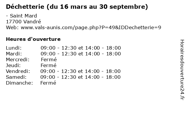 1 Déchetterie (du 16 mars au 30 septembre) (Distance: 6,04 km) - La Chaume des Fétis, 17700 Vouhé 16, 30, au, decheterie, du, déchetterie, mars, septembre, smictom 2 Déchetterie (du 16 mars au 30 septembre) (Distance: 10,70 km) - Route de Landrais, 17290 Le Thou 16, 30, au, decheterie, du, déchetterie, mars, septembre, smictom 3 Déchetterie (du 1er octobre au 15 mars ) (Distance: 0,00 km) - Saint Mard, 17700 Vandré 15, 1er, au, decheterie, du, déchetterie, mars, octobre, smictom 4 Cimetière Saint-Pierre - Mars à Septembre (Distance: 1,86 km) - Rue Albert Camus, 17700 Surgères caveau, cimetière, de, défunts, funéraire, mars, municipal, pierre, saint, septembre, service 5 Cimetière Saint-Gilles - Mars à Septembre (Distance: 2,36 km) - Rue du Faubourg Saint Gilles, 17700 Surgères caveau, cimetière, de, défunts, funéraire, gilles, mars, municipal, saint, septembre, service 6 Déchetterie (Du 16 mars au 30 septembre ) (Distance: 3,41 km) - ZI Ouest, 17700 Surgeres 16, 30, au, decheterie, du, déchetterie, mars, septembre, smictom |