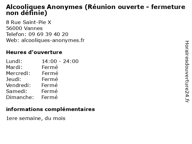 Termes de recherche pour Alcooliques Anonymes (Réunion ouverte - fermeture non définie):reunion, non, fermeture, ouverte, alcooliques, anonymes, définie, fermée |