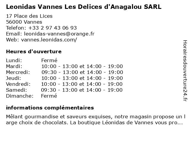 Termes de recherche pour Leonidas Vannes Les Delices d'Anagalou SARL:les, vannes, sarl, délices, leonidas, d'anagalou |