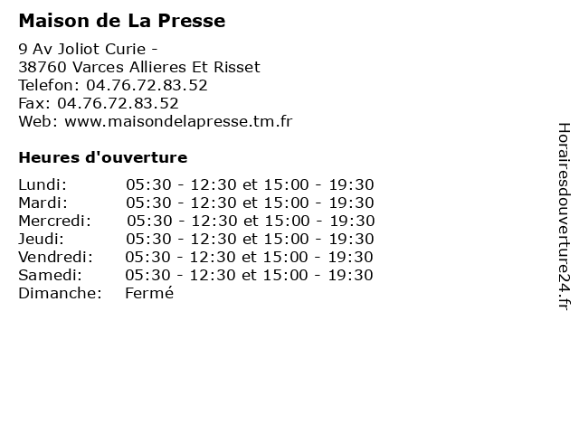 1 Maison de La Presse (Distance: 3,69 km) 9 Place Jean Monnet -, 38640 Claix cadeaux, carterie, confiserie-boissons-food, de, française des jeux, la, librairie, maison, papeterie, pmu, presse, tabac 2 Maison de La Presse (Distance: 7,37 km) 26 Rue Albert Londres, 38130 Echirolles de, la, magazine, maison, papeterie, presse, services, snack 3 Maison de La Presse (Distance: 7,37 km) 240 Avenue de la République, 38320 Bresson de, la, magazine, maison, papeterie, presse, services, snack 4 Maison de La Presse (Distance: 9,68 km) 149 Avenue de la République, 38170 Seyssinet Pariset cadeaux, carterie, confiserie-boissons-food, de, française des jeux, la, librairie, maison, papeterie, pmu, presse, tabac 5 Maison de La Presse (Distance: 14,78 km) 70 Place Julien Bertrand -, 38880 Autrans cadeaux, carterie, confiserie-boissons-food, de, française des jeux, la, librairie, maison, papeterie, pmu, presse, tabac 6 Maison de La Presse (Distance: 17,57 km) 31 Rue Jean Jaures, 38420 Domene cadeaux, carterie, confiserie-boissons-food, de, française des jeux, la, librairie, maison, papeterie, pmu, presse, tabac |