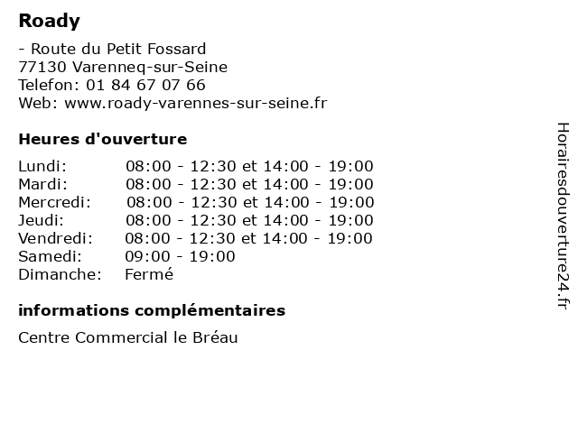 1 Roady Varennes sur Seine (Distance: 0,71 km) Route du Petit Fossard, 77130 Varennes-sur-Seine roady, seine, sur, varennes 2 Roady Varennes sur Seine (Distance: 0,71 km) CENTRE-COMMERCIAL-LE-BREAU, 77130 Varennes-sur-seine roady, seine, sur, varennes 4 Roady Joigny (Distance: 53,57 km) - Rue des Entrepreneurs, 89300 Joigny centre, entretien, garage, joigny, roady, réparation 5 Roady Longpont Sur Orge (Distance: 59,26 km) Rue du Pont aux Pins, 91310 Longpont-sur-Orge longpont, orge, roady, sur 6 A+Glass (Distance: 0,24 km) 20 Route du Petit Fossard, 77130 Varennes-sur-Seine a+glass, automobile, centre, garage, pare brise, réparation, vitrage, voiture, éclairage |