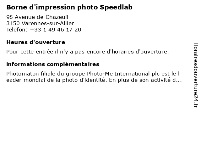 1 Borne d'impression photo Speedlab (Distance: 8,88 km) Route de Montmarault, 03500 Saint-Pourçain-sur-Sioule borne, d'impression, photo, speedlab 2 Photo De Jonghe (Distance: 8,37 km) 75 Boulevard Ledru Rollin, 03500 Saint-Pourçain-sur-Sioule de, jonghe, photo 5 Fou d'Image Photographe (Distance: 22,16 km) 7 Avenue de Vichy, 03700 Bellerive-sur-Allier d'image, fou, image, photo, photographe, portrait 6 Borne d'impression photo Speedlab (Distance: 28,00 km) 21 Place d'Allier, 03000 Moulins borne, d'impression, photo, speedlab |