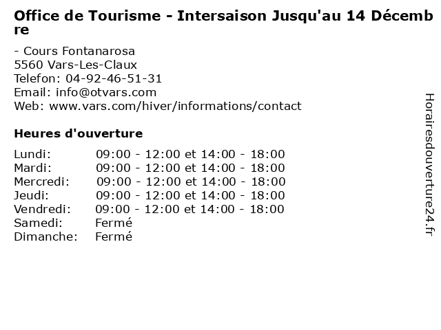 1 Office de Tourisme - Du 15 décembre au 22 Avril (Distance: 0,00 km) - Cours Fontanarosa, 05560 Vars-Les-Claux 15, 22, au, avril, de, du, décembre, horaires des musées, office, restaurants, tourisme, transports 2 Office de Tourisme - Saison été (Distance: 0,00 km) - Cours Fontanarosa, 05560 Vars-Les-Claux de, ete, horaires des musées, office, restaurants, saison, tourisme, transports, été 3 L'Office Burger (Distance: 6,68 km) immeuble L 'Eterlou, 05600 Risoul bar, burger, café, l'office, office, restaurants 6 Office de Tourisme de Jausiers (Distance: 17,64 km) 12-14 Grand Rue, 04850 Jausiers conseil, de, information, jausiers, office, renseignement, tourisme, ville, visite |