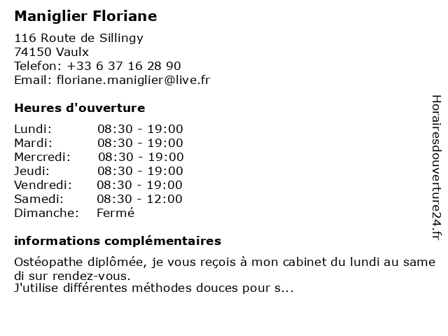 1 Dr Floriane Le Noan - Orthodontiste (Distance: 7,33 km) 21 Route de Frangy, 74960 Meythet dr, floriane, le, médecin, médecine, médical, noan, orthodontiste, pharmaceutique, traitement 2 Carrosserie Maniglier Et Fils (Distance: 9,44 km) 26 Boulevard de la Rocade, 74000 Annecy carrosserie, et, fils, maniglier, neuves, occasion, vente, voitures 3 Dr Floriane Pricaz - Médecin généraliste (Distance: 13,22 km) 400 Allee Des Allobroges, 74320 Sevrier docteur, dr, floriane, generaliste, généraliste, medical, médecin, pricaz, soin 4 Floriane Le Hebel - Ostéopathe (Distance: 21,17 km) 47 chemin Vy Darri, 74580 Viry docteur, dr, floriane, hebel, le, manipulations, massage, médecin, médecine alternative, ostéopathe, secrétariat, soin 5 Floriane Le Hebel - Ostéopathe (Distance: 33,97 km) 200 rue Nicolas Appert, 01630 Saint-Genis-Pouilly docteur, dr, floriane, hebel, le, manipulations, massage, médecin, médecine alternative, ostéopathe, secrétariat, soin 6 Dr Jean-Marc Maniglier - Médecin généraliste (Distance: 45,44 km) 125 Route de la Tonnaz, 74120 Praz-sur-Arly docteur, dr, generaliste, généraliste, jean, maniglier, marc, medecin, médecin, soins |