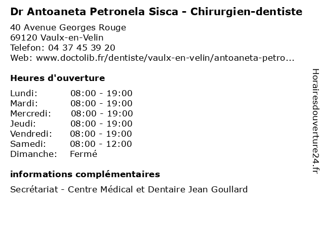 1 Sisca Antoaneta - Chirurgien-dentiste (Distance: 4,47 km) 4 Place Charles Hernu, 69100 Villeurbanne antoaneta, chirurgien, dent, dentiste, docteur, sisca, soins 2 Dr Liliana Sisca - Chirurgien-dentiste (Distance: 4,97 km) 44 Rue Feuillat, 69003 Lyon chirurgie, chirurgien, dentaire, dentiste, dr, liliana, sisca 6 |