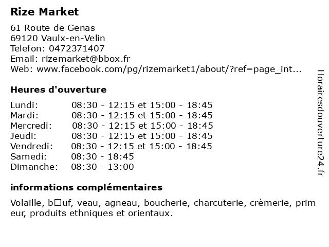 1 Rize Market (Distance: 7,82 km) 8 rue de la Rochette, 69190 Saint-Fons alimentation, boisson, halal, market, rize, supérette, épicerie 2 Rize Market (Distance: 10,82 km) 15 boulevard John Fitzgerald Kennedy, 69600 Oullins alimentation, boisson, halal, market, rize, supérette, épicerie 3 Leaf Market (Distance: 0,60 km) 254 avenue Franklin Roosevelt, 69120 Vaulx-en-Velin alimentation, boisson, fruits, leaf, légumes, market, épicerie 4 Leaf Market (Distance: 0,60 km) 254 avenue Franklin Roosevelt, 69120 Vaulx-en-Velin alimentation, boisson, fruits, leaf, légumes, market, épicerie 5 Carrefour Market (Distance: 1,88 km) 2 Rue Jacquard, 69120 Vaulx En Velin carrefour, hypermarché, market, nourriture, supermarché 6 Al Baraka Market (Distance: 2,88 km) 3 Avenue de la Rize, 69100 Villeurbanne abvil, al, baraka, epiceries, market, supermarché |