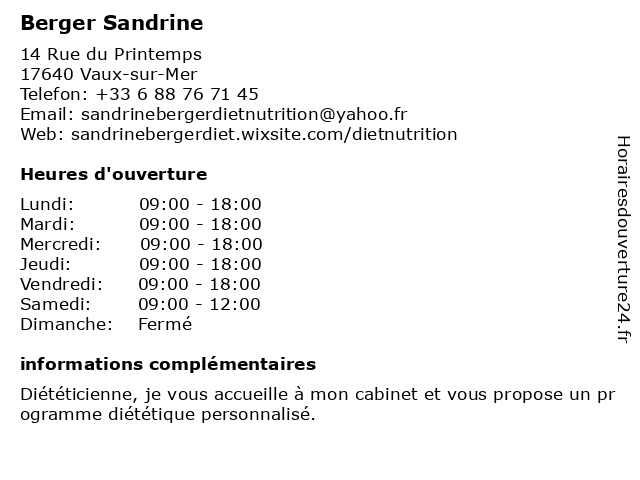 1 Dr Sandrine Doucet - Médecin morphologue et anti-âge (Distance: 1,54 km) 3 bis rue des Cerisiers, 17200 Royan age, anti, doucet, dr, et, morphologue, médecin, sandrine, soins, âge 2 Maître Sandrine Dimier Midy - Avocate (Distance: 3,33 km) 10 rue Notre Dame, 17200 Royan avocate, avocats, civils, dimier, droits, juridiques, maître, midy, sandrine 3 Sandrine Winckler - Hypnothérapeute (Distance: 4,29 km) 62 Avenue des Semis, 17200 Royan hypno, hypnose, hypnothérapeute, sandrine, sante, winckler 4 Buffier Sandrine (Distance: 12,63 km) 50 Route De Soulac, 33123 Le Verdon Sur Mer buffier, divers, détail, magasins, nra, sandrine 5 AXA Assurance et Banque Eirl Schmitt Sandrine (Distance: 19,51 km) 6B Rue François Fresneau, 17320 Marennes-Hiers-Brouage assurance, assurance appartement, assurance auto, assurance entreprise, assurance epargne, assurance habitation, assurance maison, assurance professionnelle, assurance santé, assurance voiture, axa, banque, eirl, et, sandrine, schmitt 6 Bar Restaurant l Italien (Distance: 2,69 km) All p Dugua Sieur De Mons, 17200 Royan bar, baraton, italien, restaurant, restaurants, sandrine |
