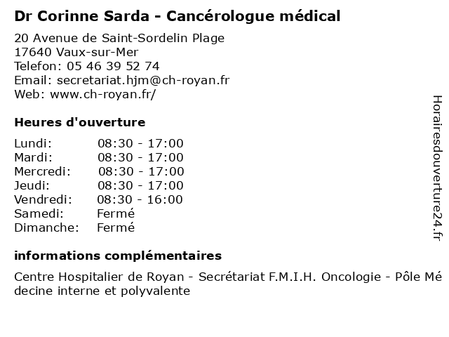 1 Cabinet Médical - Médecine générale (secrétariat ) (Distance: 0,94 km) 29 Avenue Malakoff, 17640 Vaux sur mer cabinet, consultation, docteur, générale, médecine, médical, santé, secrétariat 2 Cabinet Médical - Médecine générale (secrétariat ) (Distance: 2,61 km) 39 Avenue des Congrès, 17200 Royan cabinet, consultation, docteur, générale, médecine, médical, santé, secrétariat 3 Dr Catherine Guillet - Gynécologue médical et obstétrique (Distance: 2,66 km) 13 rue Notre Dame, 17200 Royan catherine, consultation, docteur, dr, dr., endocrinologie, et, guillet, gynécologue, médical, obstétrique, santé 5 Distri Club Médical (Distance: 7,05 km) 15 route du Magarin, 17920 Breuillet club, distri, distributeurs, magasin, médical, santé, services, soins 6 Cabinet Médical Gambetta (Distance: 11,04 km) 51 Avenue Gambetta, 17600 SAUJON cabinet, gambetta, médical |