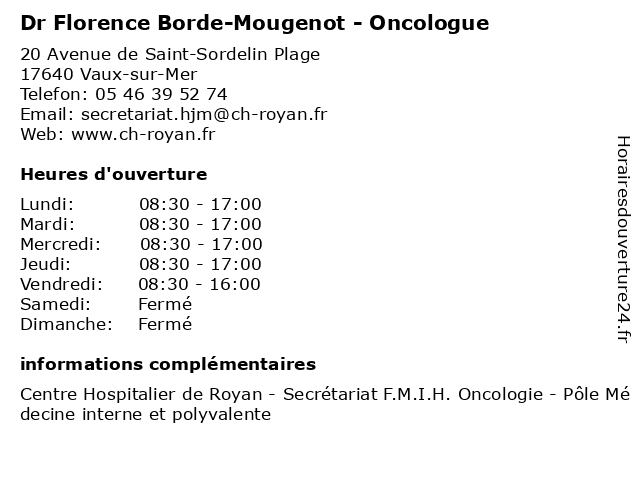1 Dr Cynthia Martin - Oncologue (Distance: 0,00 km) 20 Avenue de Saint-Sordelin Plage, 17640 Vaux-sur-Mer chimiothérapie, cynthia, dr, hémopathie, immunothérapie, martin, médicale, oncologie, oncologue, option 2 Dr Ana-Laura Anghelescu - Oncologue - Cancerologue (Distance: 0,00 km) 20 Avenue de Saint-Sordelin Plage, 17640 Vaux-sur-Mer ana, anghelescu, cancerologue, chimiothérapie, dr, hémopathie, immunothérapie, laura, médicale, oncologie, oncologue, option 3 Dr Etienne Martin - Oncologue (Distance: 0,00 km) 20 Avenue de Saint-Sordelin Plage, 17640 Vaux-sur-Mer chimiothérapie, dr, etienne, hémopathie, immunothérapie, martin, médicale, oncologie, oncologue, option 4 Au Coeur de la Métairie Florence et Benoît (Distance: 1,58 km) 74 boulevard de la Perche, 17200 Royan au, baguettes, benoît, boulangerie, coeur, de, et, florence, la, métairie, pains, pâtisserie, viennoiserie 5 Dr. Florence Burkant - Allergologie (Clinique Hartmann) (Distance: 2,65 km) 1 Rue Dr Paul Metadier,, 17200 Royan allergologie, burkant, clinique, consultation, docteur, dr., florence, hartmann, medecins, santé 6 Poupard Florence (Distance: 5,97 km) Place Du Marche, 17110 Saint Georges De Didonne florence, poupard, restaurants |