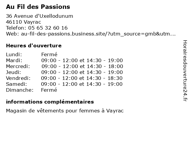 | Mardi | 09:00-12:00 et 14:30-19:00 |