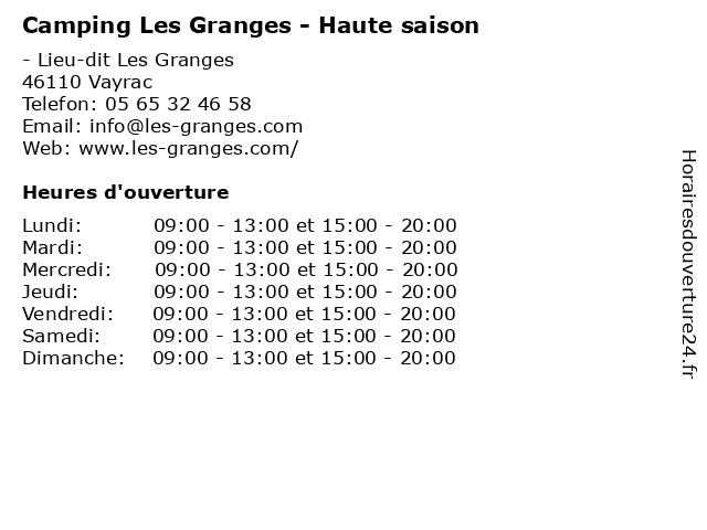 1 Camping Les Granges - Basse saison (Distance: nan km) - Lieu-dit Les Granges, 46110 Vayrac accueil, basse, camping, caravaning, en, granges, les, loisirs, saison, tourisme, vacances 2 Camping Les Granges - Snack vente à emporter (Distance: nan km) - Lieu-dit Les Granges, 46110 Vayrac camping, caravaning, emporter, granges, les, loisirs, snack, tourisme, vacances, vente 3 Aire Camping-Car Park (Distance: 2,06 km) - route de la Dordogne, 46110 Vayrac aire, borne, camping, car, eaux, park, service, stationnement, tourisme, vidange 4 Camping L'Eau Vive - Réception Haute Saison (Distance: 5,34 km) - Près Nabots, 46110 Carennac camping, haute, l'eau, loisirs, réception, saison, tourisme, vacances, vive 5 Camping L'Eau Vive - Réception Basse Saison (Distance: 5,34 km) - Près Nabots, 46110 Carennac basse, camping, l'eau, loisirs, réception, saison, tourisme, vacances, vive 6 Camping Les Chênes Clairs (Distance: 5,82 km) - Bourzole, 46110 Condat camping, caravaning, chênes, clairs, les, loisirs, tourisme, vacances |