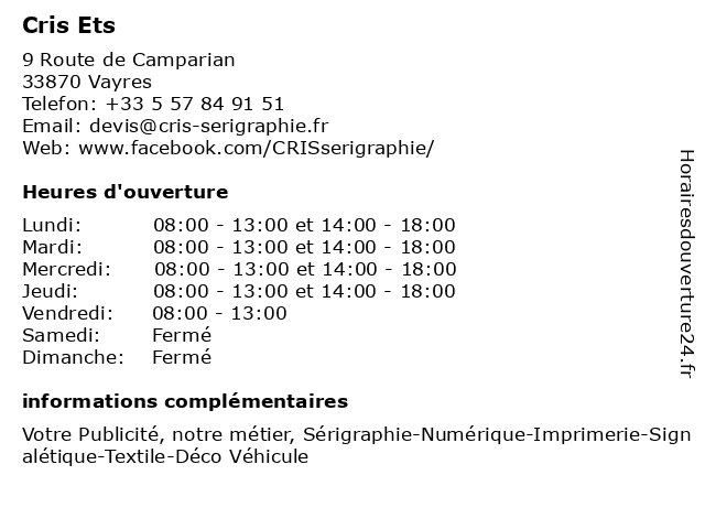 1 Cris-Serigraphie (Distance: 0,24 km) 9 route Camparian, 33870 Vayres cartouche, cris, cris-serigraphie, impression, photocopie, serigraphie 5 Janoueix Guy et Fils Ets (Distance: 8,80 km) 43 Avenue du Maréchal Foch, 33500 Libourne et, ets, fils, guy, janoueix 6 ETS MAUNIER (Distance: 11,05 km) 29 Avenue de Lignan, 33370 Fargues-Saint-Hilaire climatisation et domotique en gironde, ets, maunier, plomberie, électriciens plombiers, électricité générale |