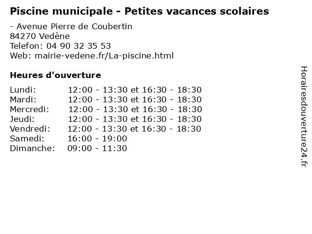 1 Piscine municipale - Juillet (Distance: 0,00 km) - Avenue Pierre de Coubertin, 84270 Vedène activité, bassins, famille, juillet, municipale, natation, piscine, sport 2 Piscine Municipale - hors vacances scolaires (Distance: 0,12 km) - Avenue Pierre de Coubertin, 84270 Vedène aqua, aquatique, hors, municipale, piscine, scolaires, vacances 3 Royal Kids (Horaires vacances scolaires) (Distance: 2,10 km) 195 Allée Montagnat, 84270 Vedene enfants, horaires, kids, loisirs, parc, royal, scolaires, vacances 4 Royal Kids (Horaires hors vacances scolaires) (Distance: 2,10 km) 195 Allée Montagnat, 84270 Vedene enfants, horaires, hors, kids, loisirs, parc, royal, scolaires, vacances 5 Piscine Municipale - Hors vacances scolaires (Distance: 4,39 km) - Avenue Pierre de Coubertin, 84130 Le Pontet aqua, aquatique, hors, municipale, piscine, scolaires, vacances 6 Le Bakaglace (vacances scolaires) (Distance: 5,22 km) 2483 chemin de l'amandier, 84140 Montfavet bakaglace, boisson, le, nourriture, restaurant, scolaires, service, vacances |