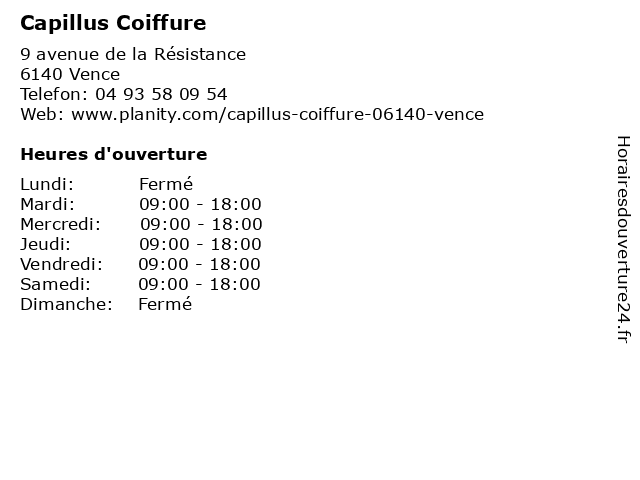 1 Coiffure Sophie (Distance: 0,12 km) 24 avenue de la Résistance, 06140 Vence barbier, coiffeur, coiffure, coloration, coupe, shampooing, sophie 2 Evolut'if Coiffure (Distance: 0,14 km) 25 avenue de la Résistance, 06140 Vence barbier, coiffeur, coiffure, coloration, coupe, evolut'if, shampooing 5 VIP ESPACE COIFFURE VENCE (Distance: 0,17 km) 164 Avenue Emile Hugues, 06140 Vence coiffure, espace, vence, vip 6 Shop Coiffure (Distance: 0,66 km) . Avenue des Pins, 26750 Saint Paul Les Romans beauté, coiffeur, coiffure, services, shop |