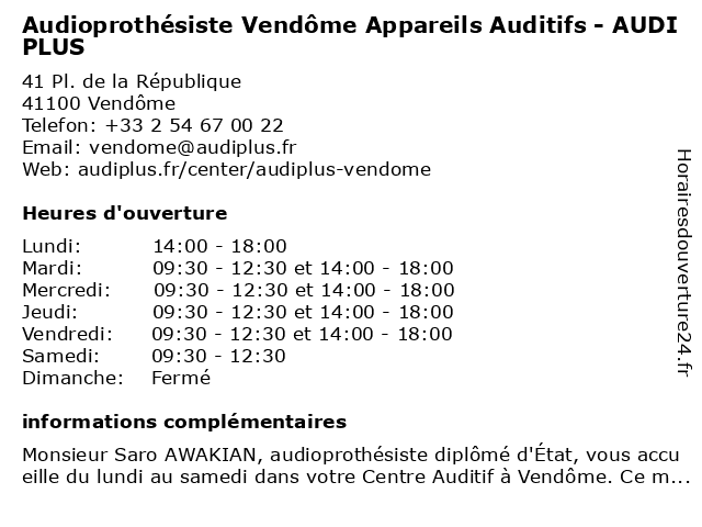 1 ACUITIS Opticien & Audioprothésiste Vendôme (Distance: 0,07 km) 16 place de la République, 41100 Vendôme acuitis, audiologiste, audioprothesiste, audioprothésiste, magasin d'appareils auditifs, magasin de lentilles de contact, magasin de lunettes de soleil, opticien, optometrie, vendôme 2 Audilab / Audioprothésiste Vendôme (Distance: 0,09 km) 29-31 Rue du Change, 41100 Vendôme audilab, audioprothésiste, vendôme 3 Audioprothésiste Vendôme Audition Santé (Distance: 0,39 km) 12 Faubourg Chartrain, 41100 Vendôme audioprothésiste, audition, santé, vendôme 4 Audilab / Audioprothésiste Vendôme Sud (Distance: 1,14 km) Route de Blois, 41100 Vendôme audilab, audioprothésiste, sud, vendôme 5 Audioprothésiste VENDOME Optical Center (Distance: 1,27 km) 133 Faubourg Chartrain, 41100 Vendôme audioprothésiste, center, optical, vendome 6 Audilab / Audioprothésiste Montoire-Sur-Le-Loir (Distance: 16,06 km) 6 Place Clemenceau, 41800 Montoire-sur-le-Loir audilab, audioprothésiste, le, loir, montoire, sur |