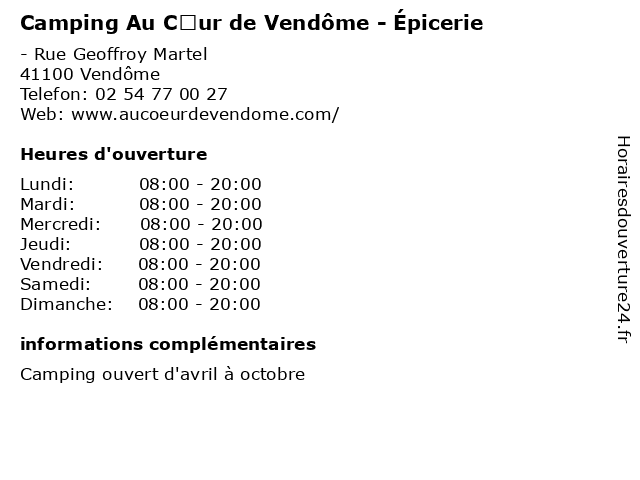 Termes de recherche pour Camping Au Cœur de Vendôme - Épicerie:de, au, vendome, épicerie, camping, loisirs, vacances, cœur, tourisme, commerces |