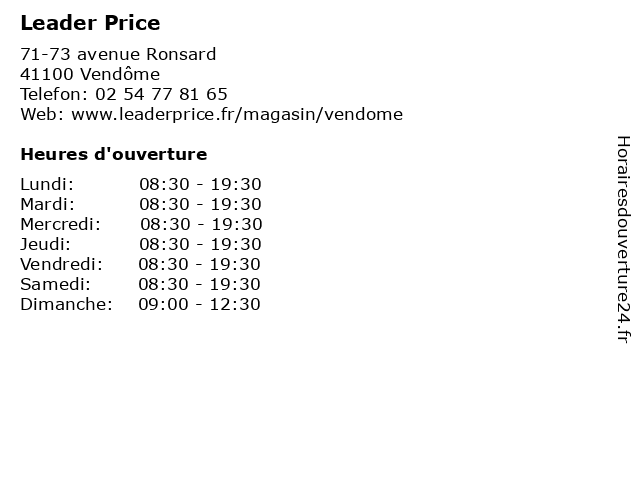 1 Leader Price (Distance: 1,85 km) 21 place St Martin, 41100 Vendome fruits, leader, market, price, supermarket 2 Carrefour Express (Distance: 26,18 km) 56 Rue Nationale, 28220 Cloyes-sur-le-Loir alimentaire, alimentation, carrefour, courses, distributeur, express, hypermarché, supermarché, épicerie 3 Carrefour Express (Distance: 32,19 km) 11 Rue du Commerce, 41000 Blois alimentaire, alimentation, carrefour, courses, distributeur, express, hypermarché, supermarché, épicerie 4 Auchan (Distance: 38,80 km) - Lieu dit La croix Poelon, 37380 Monnaie auchan, hypermarché, la nourriture, supermarchés 5 Carrefour City (Distance: 43,27 km) 5 quai du Général de Gaulle, 37400 Amboise alimentaire, alimentation, carrefour, city, courses, distributeur, hypermarché, supermarché, épicerie 6 Auchan (Distance: 46,82 km) 27 Rue des Écoles, 37210 Vouvray auchan, hypermarché, la nourriture, supermarchés |