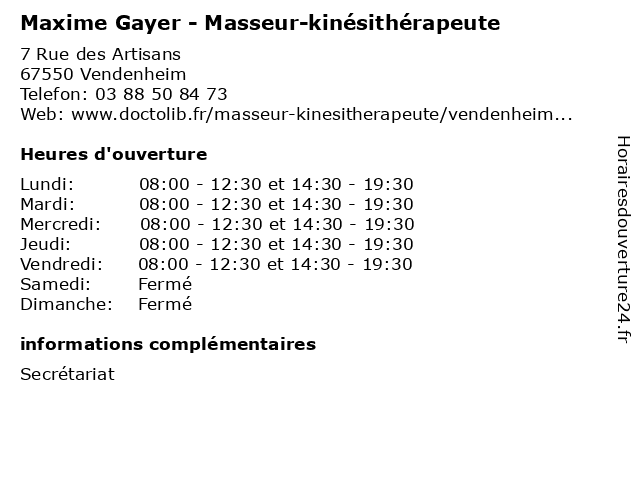 | Jeudi | 08:00-12:30 et 14:30-19:30 |