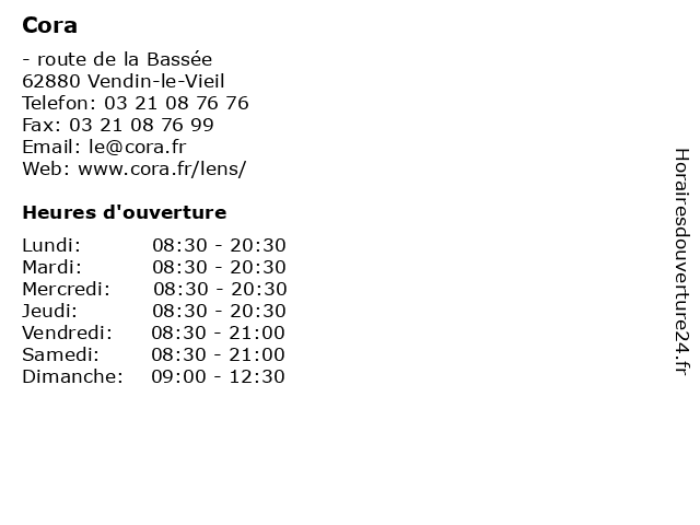 1 Cora (Distance: 9,42 km) - Route nationale 319, 62710 Courrières cora, hypermarché, la nourriture, les légumes, supermarché 2 Cora (Distance: 17,40 km) 1115 Avenue de la Libération, 62701 Bruay-la-Buissiere alimentaire, cora, hypermarché, supermarché 3 Cora Station Service (Distance: 1,64 km) - Route de la Bassée, 62880 Vendin-le-Vieil carburant, cora, essences, gazole, service, services, station 4 Orchestra - Centre Commercial Cora Lens 2 (Distance: 1,95 km) , Lens 2, 62880 Vendin le Vieil accessoires, centre, commercial, cora, lens, maternite, mode enfant, orchestra, shorts, sport 5 RougeGorge - Centre Commercial CORA LENS 2 (Distance: 4,27 km) 47 Route de la bassée, 62880 Vendin-le-Vieil accessoires, boutique, centre, commercial, cora, lens, lingerie, mode femme, nuit, rougegorge 6 Cora Station Service (Distance: 9,78 km) - Rue Raoul Briquet, 62710 Courrières carburant, cora, essences, gazole, service, services, station |
