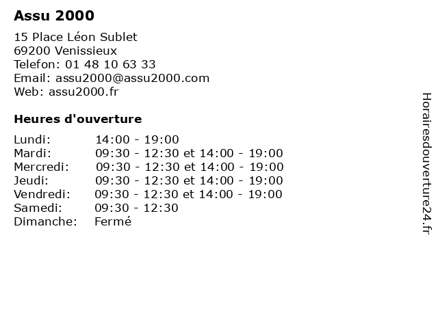 | 1 Assu 2000 (Distance: 2,40 km) 1 Rue Carnot, 69190 Saint-Fons 2000, assu, assurance, maison, moto, santé, services 2 Assu 2000 (Distance: 3,89 km) 81 Boulevard des Etats-Unis, 69008 Lyon 2000, assu, assurance, maison, moto, santé, services 3 Assu 2000 (Distance: 4,28 km) 133-135 Avenue Franklin Roosevelt, 69500 Bron 2000, assu, assurance, maison, moto, santé, services 4 Assu 2000 (Distance: 4,54 km) 52 Rue Henri Maréchal, 69800 Saint-Priest 2000, assu, assurance, maison, moto, santé, services 5 Assu 2000 (Distance: 6,07 km) 66 Grande Rue, 69600 Oullins 2000, assu, assurance, maison, moto, santé, services 6 Assu 2000 (Distance: 6,63 km) 68 Place Jules Grandclément, 69100 Villeurbanne 2000, assu, assurance, maison, moto, santé, services |