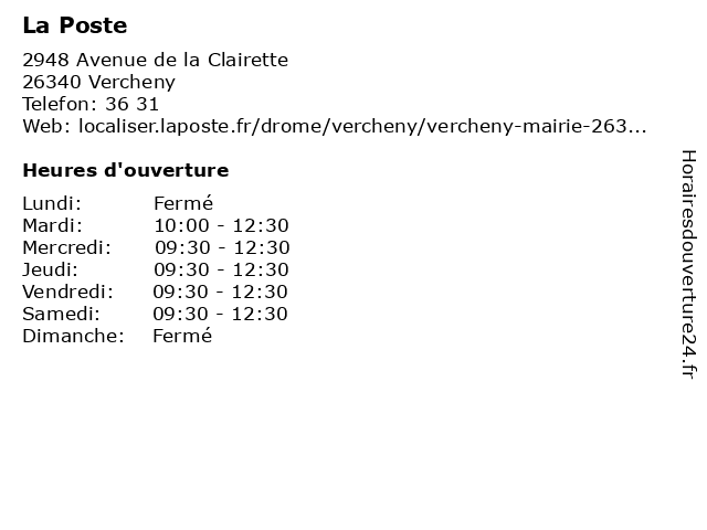 2 La Poste (Distance: 12,70 km) - Le Bourg, 26310 Recoubeau-Jansac agence, assurance, banque, banque postale, bureau de poste, chronopost, colis, courrier, dps, expéditions internationales, la, point, postale, poste, relais, timbres, téléphonie, ups, western union 3 La Poste (Distance: 13,07 km) - Rue du Reclus, 26410 Châtillon-en-Diois express chronopost, la, poste, réexpédition internationale 4 La Poste (Distance: 14,14 km) - Place du Prieuré, 26340 Saillans agence, assurance, banque, banque postale, bureau de poste, chronopost, colis, courrier, dps, expéditions internationales, la, point, postale, poste, relais, timbres, téléphonie, ups, western union 5 La Poste (Distance: 14,87 km) - Avenue Georges Magnat, 26420 Vassieux-en-Vercors agence, colis, courriers, expédition, la, postale, poste, relais 6 La Poste (Distance: 17,82 km) - Route de Suze, 26400 Beaufort-sur-Gervanne agence, assurance, banque, banque postale, bureau de poste, chronopost, colis, courrier, dps, expéditions internationales, la, point, postale, poste, relais, timbres, téléphonie, ups, western union |