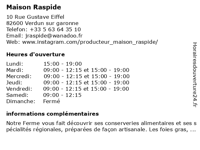 1 Raspide Jean Marc (Distance: 0,96 km) Lieu Dit La Riviere Basse, 82600 Verdun Sur Garonne bailleurs, biens, immobiliers, jean, marc, nra, raspide 2 Les Toits de Verdun (Distance: 0,98 km) 5 rue Joliot Curie, 82600 Verdun sur Garonne agence, de, gestion, immobilier, les, location, maison, toits, transaction, vente, verdun 3 Maison des Solidarités (Distance: 11,17 km) 3 rue des Ecoles, 82700 Montech des, familiale, maison, psychologues, solidarités, économie sociale, éducateurs 4 Agence immobilière Laforêt Montech (Distance: 11,31 km) 8 Place Jean Jaurès, 82700 Montech acheter, acheter appartement, acheter maison, agence, agence immobilière, agent immobilier, gestion locative, immobilière, laforêt, location, location appartement, location maison, montech, transaction, vendre appartement, vendre maison 5 France Services (Distance: 22,77 km) s/n Place de l'Église, 82290 La Ville-Dieu-du-Temple administration, au, de, dieu, du, france, la, maison, organismes, public, publics, services, temple, ville 6 Franprix (Distance: 24,01 km) 56 Vignobles, 75020 PARIS alimentation générale, entretien de la maison et de l'hygiène, franprix, franprix magasin, fruits et légumes frais |