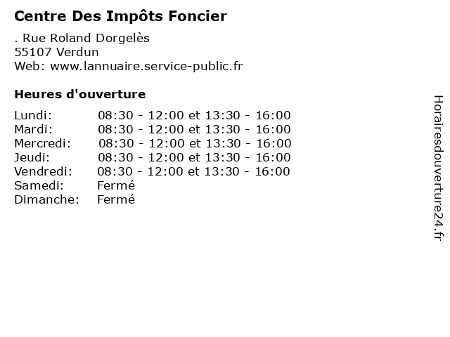 1 Service des impôts des particuliers du centre des finances publiques (Distance: 0,01 km) - Rue Roland Dorgeles, 55100 Verdun administration, centre, des, du, etat, finances, impots, impôts, particulier, particuliers, publiques, service 2 Credit Foncier De France (Distance: 0,25 km) 11 rue St Pierre, 55100 Verdun banques, cff, commerciales, credit, de, foncier, france, nationales 3 Service des impôts des particuliers du centre des finances publiques (Distance: 41,43 km) 16 avenue Albert de Briey, 54150 Val de Briey administration, centre, des, du, etat, finances, impots, impôts, particulier, particuliers, publiques, service 4 Centre des Impôts Foncier de Bar-le-Duc (Distance: 46,85 km) 24 avenue du 94e-Régiment-d'Infanterie, 55013 Bar-le-Duc administration, assoc, bar, centre, de, des, duc, foncier, impôts, le, services, services publics 5 Centre des Impôts Foncier d'Hayange (Distance: 52,79 km) . Place Nicolas-Schneider, 57705 Hayange administration, assoc, centre, d'hayange, de, des, foncier, hayange, impôts, services, services publics 6 Centre Des Impôts - Vouziers Impôts (Distance: 55,71 km) 86 Rue Gambetta, 08400 Vouziers centre, des, impôts, publics, services, vouziers |