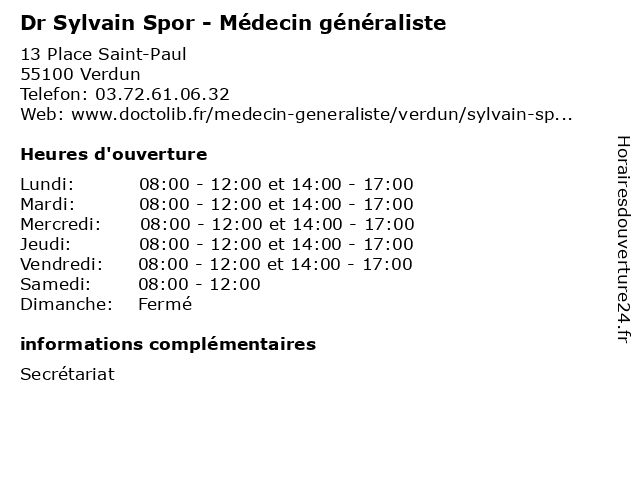 1 Dr Sylvain Spor - Médecin généraliste (Distance: 0,00 km) 13 Place Saint-Paul, 55100 Verdun consultation, docteur, domicile, dr, en, générale, généraliste, médecin, médecine, médecins, santé, spor, sylvain, visite 2 3 Sylvain Sarcelet - Office notarial (Distance: 36,29 km) 9 place du Général Leclerc, 51800 Sainte-Menehould assoc, biens, notaire, notaires, notarial, office, sarcelet, sylvain 4 Autoprimo - Garage Sylvain Schlesser (Distance: 37,79 km) - Route De Vigneulles, 55210 Heudicourt-sous-les-Côtes ad, auto, automobiles, autoprimo, concessionnaire, distribution, garage, motos, schlesser, sylvain 6 Dr Sylvain Furini - Médecin généraliste (Distance: 55,24 km) 53 Rue Louis Jost, 57175 Gandrange consultation, docteur, domicile, dr, dr.sylvain, en, furini, générale, généraliste, médecin, médecine, santé, sylvain, visite |