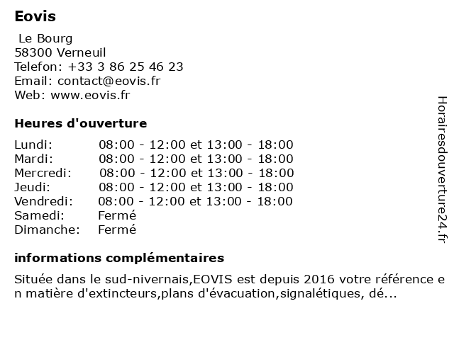 Située dans le sud-nivernais,EOVIS est depuis 2016 votre référence en matière d'extincteurs,plans d'évacuation,signalétiques, désenfumage,éclairage de sécurité,défibrillateurs et matériels de secours.