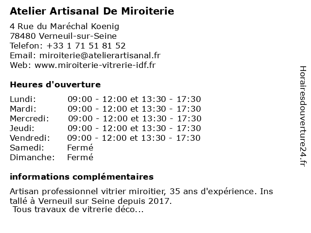 2 L'Atelier Beauté 78 (Distance: 2,00 km) 47 Allée des Princes, 78480 Verneuil-sur-Seine 78, beauté, esthétique, l'atelier, manucure, salon, spa 3 Miroiterie des Mureaux et de la Seine (Distance: 4,92 km) 41 Rue des Fontenelles, 78920 Ecquevilly de, des, et, la, miroiterie, mureaux, seine 6 |