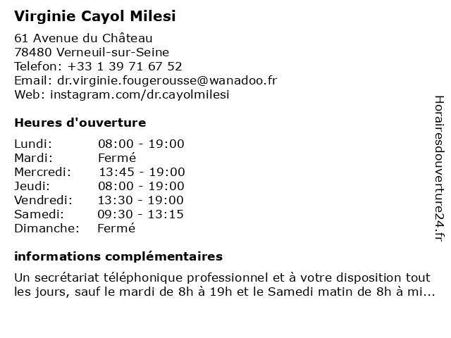 1 Dr Virginie Fougerousse - Médecin généraliste - secrétariat (Distance: 0,20 km) 10 Quater Grande Rue,, 78480 Verneuil-sur-Seine dr, fougerousse, généraliste, médecin, médecins, médicaments, santé, secrétariat, spécialiste, virginie 2 Virginie Payet - Psychologue (Distance: 0,82 km) 16 avenue de Triel, 78540 Vernouillet cabinets, médecins, payet, psychologue, secrétariat, thérapies, virginie 3 Virginie Payet - Psychologue - secrétariat (Distance: 0,86 km) 16 Avenue de Triel, 78540 Vernouillet cabinets, médecins, payet, psychologue, secrétariat, thérapies, virginie 4 Virginie Payet - Psychologue - secretariat (Distance: 0,86 km) 16 Avenue de Triel, 78540 Lyon médecin, médecine, médical, payet, pharmaceutique, psychologue, secretariat, traitement, virginie 5 Walter Legrand Virginie Carine (Distance: 5,11 km) Batiment a, 78570 Andresy carine, legrand, restaurants, virginie, walter 6 Virginie Argiros - Diététicien - secrétariat (Distance: 8,97 km) 269 Avenue Carnot, 78700 Conflans-Sainte-Honorine argiros, cabinet, diététicien, diététique, medical, secrétariat, virginie |