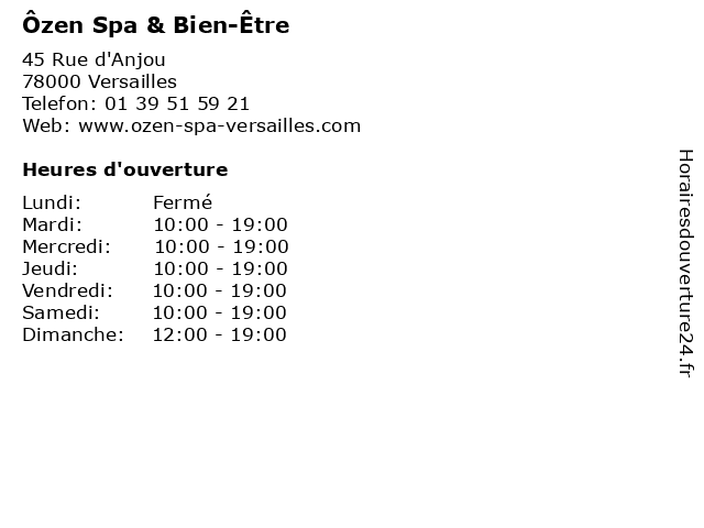 1 Thai royal spa (Distance: 0,52 km) 25 rue du vieux Versailles, 78000 Versailles massage, relaxation, royal, soins, spa, thai 2 Chang Kham Thai Spa (Distance: 0,52 km) 25 Rue du Vieux Versailles, 78000 Versailles bien-entre, chang, kham, massages, relaxation, santé, spa, thai, thérapies 3 Kinaree Thai Spa (Distance: 0,55 km) 39 Rue des Etats Généraux, 78000 Versailles beaute, kinaree, massages, spa, thai 4 Chloé Aldana - Créatrice de Bien-être (Distance: 0,98 km) 4 Place Hoche, 78000 Versailles aldana, beaute, bien, chloé, créatrice, de, formation, massage, salon, santé, soins, être 5 Institut de beauté & Spa Cinq Mondes Paris (Distance: 1,10 km) 16 rue Hoche, 78000 Versailles beauté, cinq, de, institut, massage, mondes, paris, relaxation, soins, spa 6 Piscine Montbauron - Espace Bien-Être (Distance: 1,17 km) 7 rue Léon Gatin, 78000 Versailles bien, espace, montbauron, piscine, récréative, éte, être |