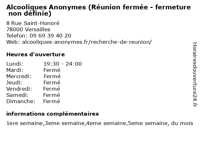 Termes de recherche pour Alcooliques Anonymes (Réunion fermée - fermeture non définie):reunion, non, fermeture, alcooliques, anonymes, définie, fermée |