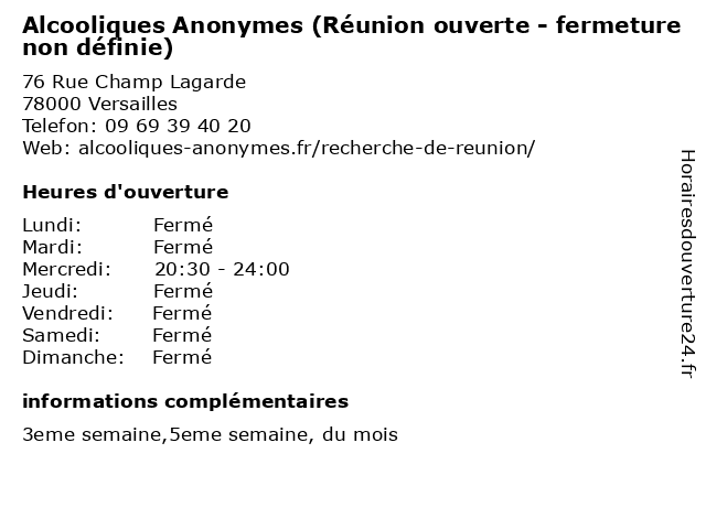 Termes de recherche pour Alcooliques Anonymes (Réunion ouverte - fermeture non définie):reunion, non, fermeture, ouverte, alcooliques, anonymes, définie |