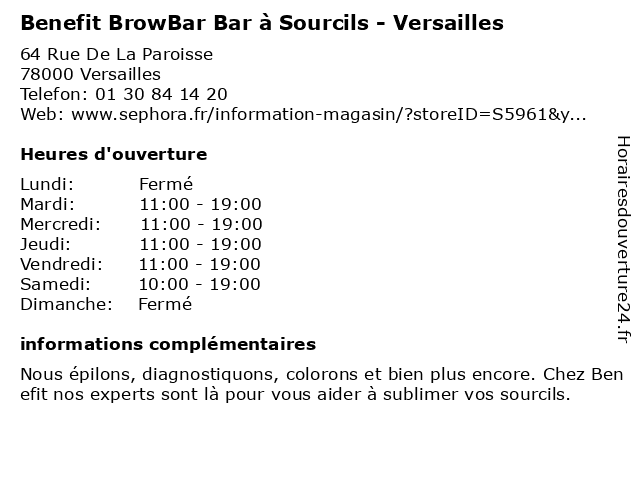 Termes de recherche pour Benefit BrowBar Bar à Sourcils - Versailles:bar, versailles, salon de beauté, benefit, sourcils, magasin de produits cosmétiques, browbar |