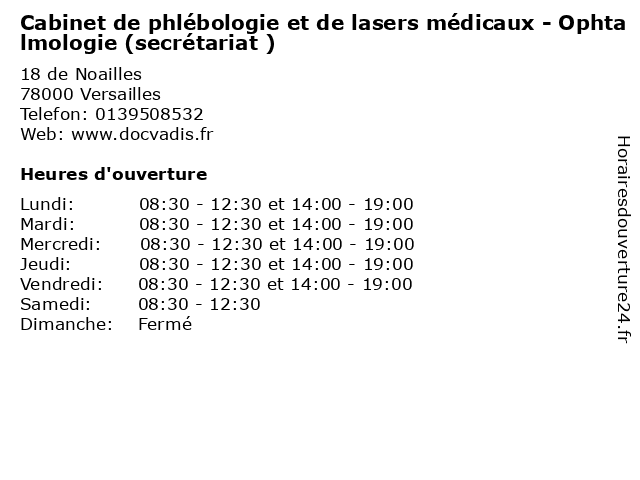 1 Cabinet Médical - Médecine générale (secrétariat ) (Distance: 0,07 km) 29 rue de Noailles, 78000 Versailles bruno, cabinet, consultation, docteur, générale, masi, médecine, médical, santé, secrétariat 2 Cabinet Louergli (Distance: 0,27 km) 15 rue Benjamin Franklin, 78000 Versailles cabinet, cabinet louergli, calcul, comptabilité, expert, louergli 3 Cabinet Marin Etudes et Conseils (Distance: 0,33 km) 27 Avenue de Sceaux, 78000 Versailles cabinet, conseils, et, etudes, marin 4 Cabinet Pagniez Wattinne Avocats (Distance: 0,39 km) 5 Impasse des Gendarmes, 78000 Versailles avocats, cabinet, juridique, juristes, pagniez, wattinne 5 Dr. Nadia Charra - Ophtalmologie (Consultation sur rendez-vous) (Distance: 0,47 km) 7 de la Porte de Buc, 78000 VERSAILLES charra, consultation, docteur, dr., medecins, nadia, ophtalmologie, rendez, santé, sur, vous 6 Cabinet Mansart (Distance: 0,58 km) 28 Rue Royale, 78000 Versailles agence, agent, cabinet, gestion, immobilier, immobilière, mansart, vente |
