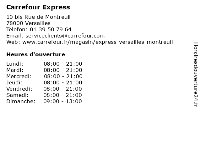 1 Carrefour Express (Distance: 0,90 km) 83 Rue du Maréchal Foch, 78000 Versailles carrefour, electrical appliances, express, furnitures, garden equipment, shelving 2 Carrefour Express (Distance: 1,10 km) 83 rue du Maréchal Foch, 78000 Versailles carrefour, express, hard discount, hypermarchés, les dépanneurs, supermarchés 3 Carrefour Express (Distance: 1,19 km) - Gare De Versailles Chantiers, 78000 Versailles carrefour, express, gare, station, superette 5 Carrefour Express (Distance: 1,61 km) 100 Rue de Versailles, 78150 Le Chesnay alimentation, carrefour, express, magasin discount, market, supermarché 6 Carrefour Express (Distance: 6,25 km) 35 boulevard de la République, 92210 Saint-Cloud alimentation, carrefour, express, magasin discount, market, supermarché |