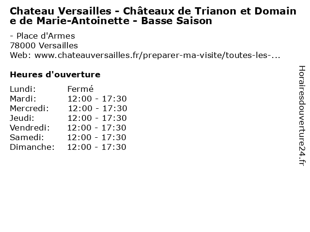 1 Chateau Versailles - Châteaux de Trianon et Domaine de Marie-Antoinette - Haute Saison (Distance: 0,00 km) - Place d'Armes, 78000 Versailles ancien, antoinette, art, chateau, châteaux, de, domaine, et, exposition, haute, histoire, livre, marie, monument, musee, musée, saison, savoir, trianon, versailles 2 Chateau Versailles - Château - Basse Saison (Distance: 0,00 km) - Place d'Armes, 78000 Versailles ancien, art, basse, chateau, château, et, exposition, histoire, livre, monument, musee, musée, saison, savoir, versailles 3 Chateau Versailles - Galerie des Carrosses - Basse Saison (Distance: 0,00 km) - Place d'Armes, 78000 Versailles ancien, art, basse, carrosses, chateau, des, et, exposition, galerie, histoire, livre, monument, musee, musée, saison, savoir, versailles 4 Chateau Versailles - Jardins & Parc - Basse Saison (Distance: 0,00 km) - Place d'Armes, 78000 Versailles ancien, art, basse, chateau, et, exposition, histoire, jardins, livre, monument, musee, musée, parc, saison, savoir, versailles 5 Domaines et Châteaux DDC (Distance: 7,29 km) 25 Rue aux Fleurs, 78960 Voisins-le-Bretonneux châteaux, ddc, domaines, et 6 Maître Ariane Châteaux - Avocate (Distance: 12,96 km) 6 Place de la Pyramide, 92800 Puteaux ariane, avocate, avocats, chateaux, châteaux, civils, droits, juridiques, maître, palies |