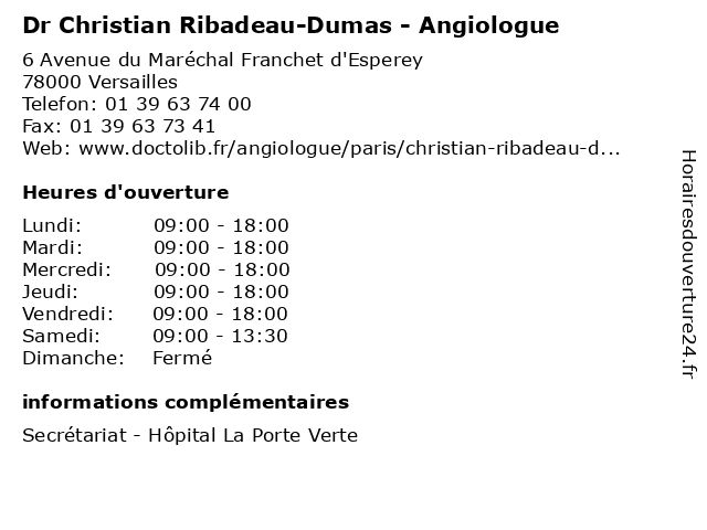 1 Dr Christian Ribadeau-Dumas - Angiologue (Distance: 11,36 km) 121 bis rue de la Pompe, 75016 Paris angiologue, christian, consultation, docteur, dr, dumas, med, médecin, médecine, ribadeau, secrétariat, traitement 2 Dr Christian Ribadeau-Dumas - Angiologue (Distance: 11,76 km) 55 Boulevard du Château, 92200 Neuilly-sur-Seine angiologue, christian, consultation, docteur, dr, dumas, med, médecin, médecine, ribadeau, secrétariat, traitement 3 Dr Jérôme Le Magrex - Angiologue (Distance: 0,34 km) 49 Rue du Parc de Clagny, 78000 Versailles angiologie, angiologue, consultation, docteur, doppler, dr, echo, jérôme, le, magrex, phlébologie, santé 4 Medecin Pascale Rambaud Bastien (Angiologue) (Distance: 1,27 km) 83 Boulevard de la Reine, 78000 Versailles angiologue, bastien, docteur, medecin, pascale, rambaud, sante, services 5 Dr Adeline Dumas - Psychiatre (Distance: 1,67 km) 177 rue de Versailles, 78150 Le Chesnay adeline, consultation, docteur, dr, dumas, med, médecin, psychiatre, traitement 6 Dr Olivier Aycard - Angiologue (Distance: 1,94 km) 21 Rue Moxouris, 78150 Le Chesnay angiologue, aycard, cabinet, dr, medical, olivier, secretariat, traitements, vasculaires |