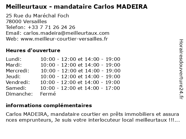 1 Meilleurtaux.com (Distance: 0,30 km) 9 place Hoche, 78000 Versailles credit, immobilier, meilleurtaux.com, services 2 Meilleurtaux.com (Distance: 4,15 km) 47 Rue Anatole France, 92370 Chaville credit, immobilier, meilleurtaux.com, services 3 Meilleurtaux.com (Distance: 8,85 km) 2 boulevard Maréchal Joffre, 92500 Rueil Malmaison credit, immobilier, meilleurtaux.com, services 4 Meilleurtaux.com (Distance: 10,29 km) 8 rue des Coches, 78100 Saint Germain en Laye credit, immobilier, meilleurtaux.com, services 5 Meilleurtaux.com (Distance: 11,81 km) 20 rue Alphonse Pécard, 91190 Gif Sur Yvette assurances, credit, financement, immobilier, meilleurtaux.com, placement et epargne, services 6 Meilleurtaux.com (Distance: 12,20 km) 76 Route de la Demi-Lune, 92800 Puteaux – La Défense credit, immobilier, meilleurtaux.com, services |