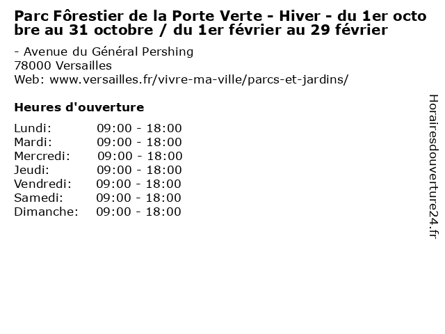 1 Parc Fôrestier de la Porte Verte - Hiver - du 1er novembre au 31 janvier (Distance: 0,00 km) - Avenue du Général Pershing, 78000 Versailles 1er, 31, arbre, au, de, du, espace vert, forêt, fôrestier, hiver, janvier, jardin, la, loisirs, nature, novembre, parc, porte, prairie, verte 2 Parc Fôrestier de la Porte Verte - Hiver - du 1er mars au 30 avril (Distance: 0,00 km) - Avenue du Général Pershing, 78000 Versailles 1er, 30, arbre, au, avril, de, du, espace vert, forêt, fôrestier, hiver, jardin, la, loisirs, mars, nature, parc, porte, prairie, verte 3 Parc Fôrestier de la Porte Verte - Été (Distance: 0,00 km) - Avenue du Général Pershing, 78000 Versailles arbre, de, espace vert, forêt, fôrestier, jardin, la, loisirs, nature, parc, porte, prairie, square, verte, été 4 Square Léo Delibes - Hiver - du 1er octobre au 31 octobre / du 1er février au 29 février (Distance: 0,36 km) - Chemin de Fausses Reposes, 78000 Versailles 1er, 29, 31, arbre, au, delibes, du, espace vert, forêt, février, hiver, jardin, loisirs, léo, nature, octobre, parc, prairie, square 5 Parc Balbi - Hiver - du 1er octobre au 31 octobre / du 1er février au 29 février (Distance: 1,57 km) - Rue du Maréchal Foch, 78000 Versailles 1er, 29, 31, arbre, au, balbi, du, espace vert, forêt, février, hiver, jardin, loisirs, nature, octobre, parc, prairie, square 6 Square Hoche - Hiver - du 1er octobre au 31 octobre / du 1er février au 29 février (Distance: 1,85 km) - Place Hoche, 78000 Versailles 1er, 29, 31, arbre, au, du, espace vert, forêt, février, hiver, hoche, jardin, loisirs, nature, octobre, parc, prairie, square |