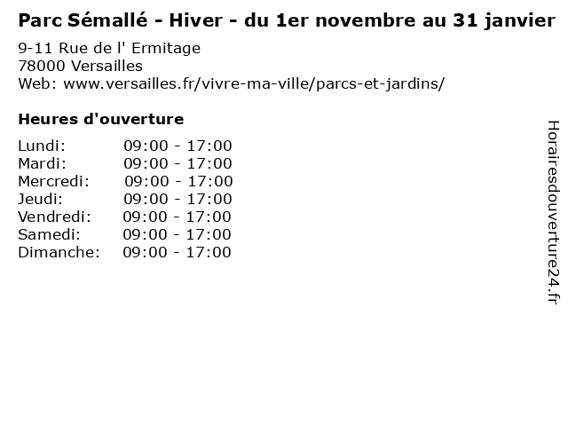 1 Parc Sémallé - Hiver - du 1er octobre au 31 octobre / du 1er février au 29 février (Distance: 0,00 km) 9-11 Rue de l' Ermitage, 78000 Versailles 1er, 29, 31, arbre, au, du, espace vert, forêt, février, hiver, jardin, loisirs, nature, octobre, parc, prairie, square, sémallé 2 Parc Sémallé - Hiver - du 1er mars au 30 avril (Distance: 0,00 km) 9-11 Rue de l' Ermitage, 78000 Versailles 1er, 30, arbre, au, avril, du, espace vert, forêt, hiver, jardin, loisirs, mars, nature, parc, prairie, square, sémallé 3 Parc Sémallé - Été (Distance: 0,00 km) 9-11 Rue de l' Ermitage, 78000 Versailles arbre, espace vert, forêt, jardin, loisirs, nature, parc, prairie, square, sémallé, été 4 Square Berthier - Hiver - du 1er octobre au 31 octobre / du 1er février au 29 février (Distance: 0,15 km) - Rue Berthier, 78000 Versailles 1er, 29, 31, arbre, au, berthier, du, espace vert, forêt, février, hiver, jardin, loisirs, nature, octobre, parc, prairie, square 5 Square Berthier - Hiver - du 1er novembre au 31 janvier (Distance: 0,15 km) - Rue Berthier, 78000 Versailles 1er, 31, arbre, au, berthier, du, espace vert, forêt, hiver, janvier, jardin, loisirs, nature, novembre, parc, prairie, square 6 Square Hoche - Hiver - du 1er octobre au 31 octobre / du 1er février au 29 février (Distance: 0,82 km) - Place Hoche, 78000 Versailles 1er, 29, 31, arbre, au, du, espace vert, forêt, février, hiver, hoche, jardin, loisirs, nature, octobre, parc, prairie, square |