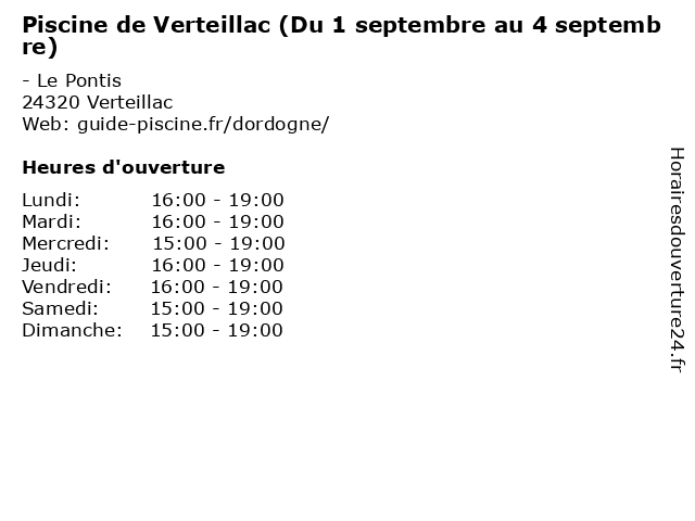 1 Piscine de Verteillac (Du 28 mai au 5 juillet) (Distance: 0,00 km) - Le Pontis, 24320 Verteillac 28, au, de, du, juillet, mai, natation sportive, piscine, sportif, verteillac 2 Piscine de Verteillac (Du 6 juillet au 31 août) (Distance: 0,00 km) - Le Pontis, 24320 Verteillac 31, août, au, de, du, juillet, natation sportive, piscine, sportif, verteillac 3 Déchetterie (1er mai au 30 septembre) (Distance: 0,63 km) - Le Mas, 24320 Verteillac 1er, 30, au, decheterie, dechets, dechetterie, déchetterie, mai, septembre 4 Piscine de Ribérac (1re semaine de septembre) (Distance: 11,00 km) - Avenue de Royan, 24600 Ribérac 1re, de, natation sportive, piscine, ribérac, semaine, septembre, sportif 5 Déchetterie (1er mai au 30 septembre) (Distance: 11,07 km) - ZI Les Chaumes, 24600 Ribérac 1er, 30, au, decheterie, dechets, dechetterie, déchetterie, mai, septembre 6 Agence Garandeau Matériaux (1er avril - 30 septembre) (Distance: 12,56 km) - Rue Fontaine, 24340 Mareuil 1er, 30, agence, avril, construction, garandeau, materiaux, matériaux, septembre |