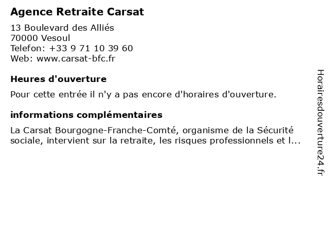1 Service social Carsat Bourgogne-Franche-Comté (Distance: 0,05 km) 9 bd des Alliés, 70000 Vesoul bourgogne, carsat, comté, franche, service, social 2 Agence conseil retraite Agirc-Arrco de Vesoul (Distance: 0,27 km) 5 Rue des Bains, 70000 Vesoul agence, agirc, arrco, conseil, de, retraite, vesoul 3 Cicas (Distance: 0,58 km) 37 Rue Georges-Genoux, 70000 Vesoul cicas, epargne, epargne entreprises, retraite, services 4 A L HARMONIE (Distance: 18,01 km) 16 Rue de Compostelle, 70110 Marast coach de vie, coaching bien-être en haute-saône, développement personnel, harmonie, ressourcement mieux-être, retraite spirituelle, séjours détente en haute-saône 5 Cicas (Distance: 42,14 km) 11a Rue Chopard, 25011 Besançon cicas, epargne, epargne entreprises, retraite, services 6 Pro BTP (Distance: 46,62 km) 19, rue Victor Hugo, 70100 Gray auto, btp, epargne, habitation, prevoyance, pro, retraite, sante, vacances |